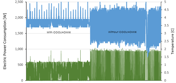 Thêm vào đó, ngoài tiết kiệm năng lượng, ổn định nhiệt độ thì đảm bảo an toàn thực phẩm cao cũng là nhiệm vụ quan trọng của chúng tôi mà COOLNOMIX® đã góp phần vào thành công đó trong việc bảo quản thực phẩm lạnh. Do đó, chúng tôi rất hài lòng rằng báo cáo của Mantra chỉ ra rằng, ngoài việc cung cấp tiết kiệm năng lượng 23%, COOLNOMIX® đã cung cấp một cải tiến đáng kể về ổn định nhiệt độ trong khi lắp vào các thiết bị làm lạnh. Trên thực tế, cả hai hiệu ứng được minh họa một cách sinh động trong sơ đồ dưới đây lấy từ báo cáo thử nghiệm của Mantra về COOLNOMIX® (mức tiêu thụ năng lượng ở màu xanh lá cây và ổn định nhiệt độ màu xanh lam).
