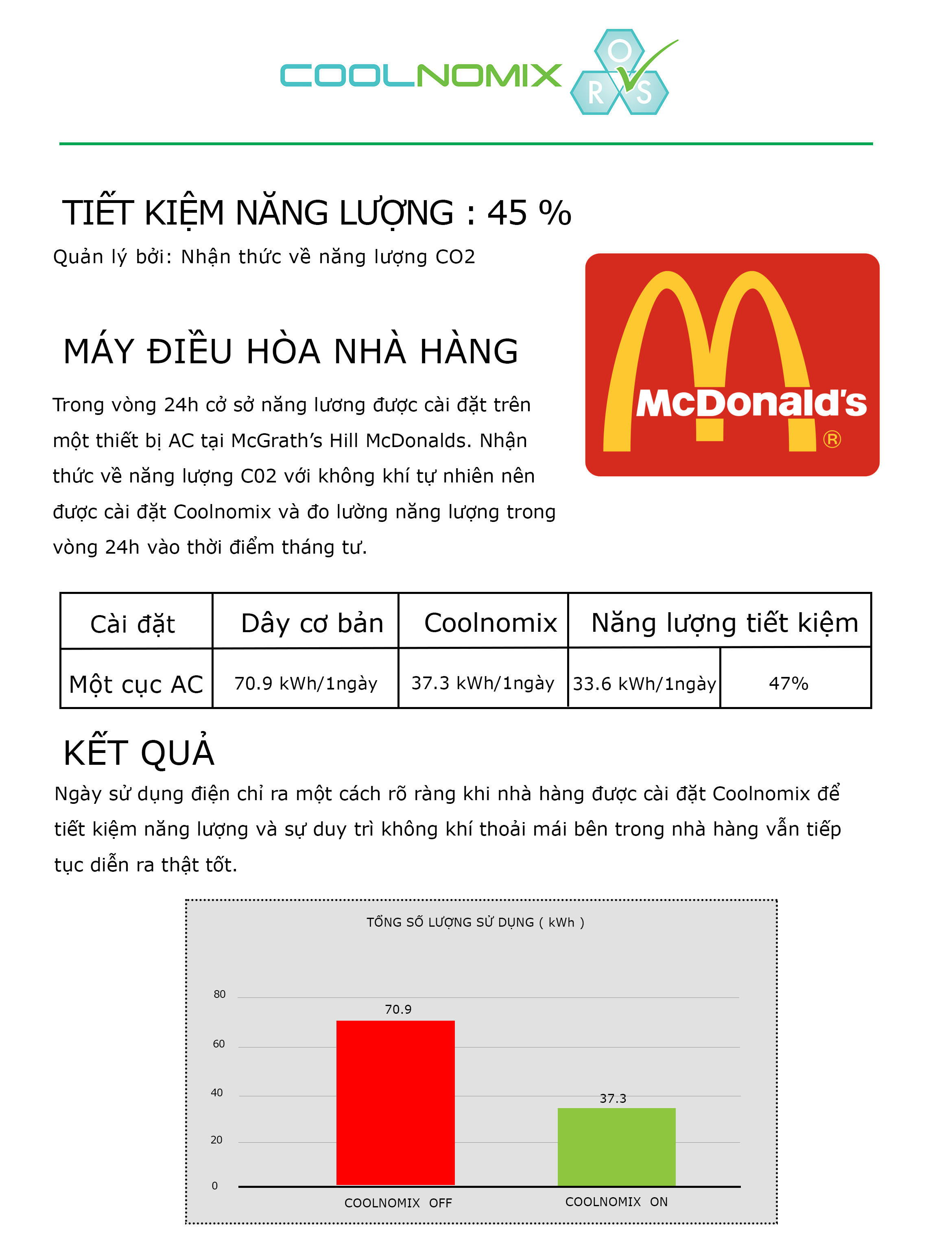 COOLNOMIX®, hệ thống kiểm soát năng lượng hàng đầu trên thế giới đã giảm 47% mức tiêu thụ năng lượng liên quan đến điều hòa không khí tại cửa hàng McDonald McGraths Hill ở Sydney.
