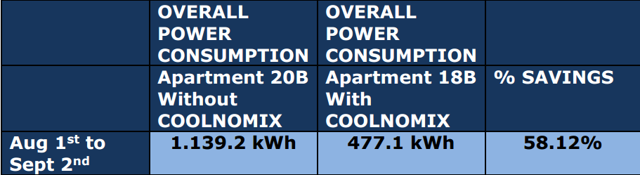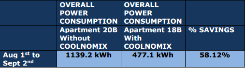 Thử nghiệm chứng minh rằng hệ thống điều khiển năng lượng COOLNOMIX ™ đã giảm chi phí điều hành máy lạnh trong căn hộ 18B là 58% so với mức tiêu thụ năng lượng trong căn hộ 20B trong suốt chương trình thử nghiệm, như trong Bảng 1 ở trang tiếp theo.