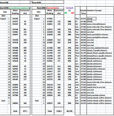 Bảng 2 ở trang tiếp theo cho thấy một bản tóm tắt các con số tiêu thụ điện năng cho hai căn hộ trong suốt tháng 8. Nó cũng cung cấp về các loại điều kiện thời tiết phổ biến trong mỗi ngày trong thời gian thử nghiệm dài tháng.