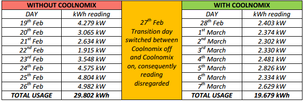 Các số liệu và biểu đồ ở trên cho thấy trong suốt giai đoạn thử nghiệm, khi thiết bị COOLNOMIX® hoạt động đã tiết kiệm được 34%. Nó cũng cho thấy COOLNOMIX® cung cấp điều khiển nhiệt độ chính xác hơn, thường +/- 0.5 ° C so với điều khiển thông thường +/- 1 ° C - 2 ° C mà không ảnh hưởng đến mức độ thoải mái được đặt ra trước đó.