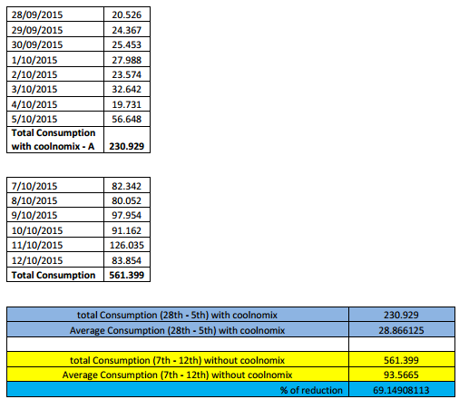 Các thử nghiệm thực địa được thực hiện đầu tiên tại Muhaisnah của trung tâm giao dịch UAE được coi là thành công vì chúng ta đã có thể giảm đáng kể mức tiêu thụ điện năng. Tuy nhiên, có thể giảm được nhiều hơn bằng cách lắp đặt lại tất cả các máy điều hoà tại đây với Coolnomix. Sau khi khắc phục tất cả các vấn đề trước đó tại chi nhánh tuần trước, cho đến ngày chúng tôi đã không nhận được bất kỳ khiếu nại hoặc các vấn đề nào khác.